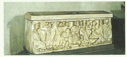La porta a sinistra immette in un piccolo ricetto, in cui e' un lavabo in marmo di complessa composizione ispirato a motivi classici, recentemente restaurato e attribuito a Donatello.